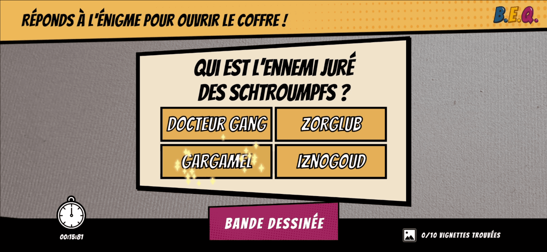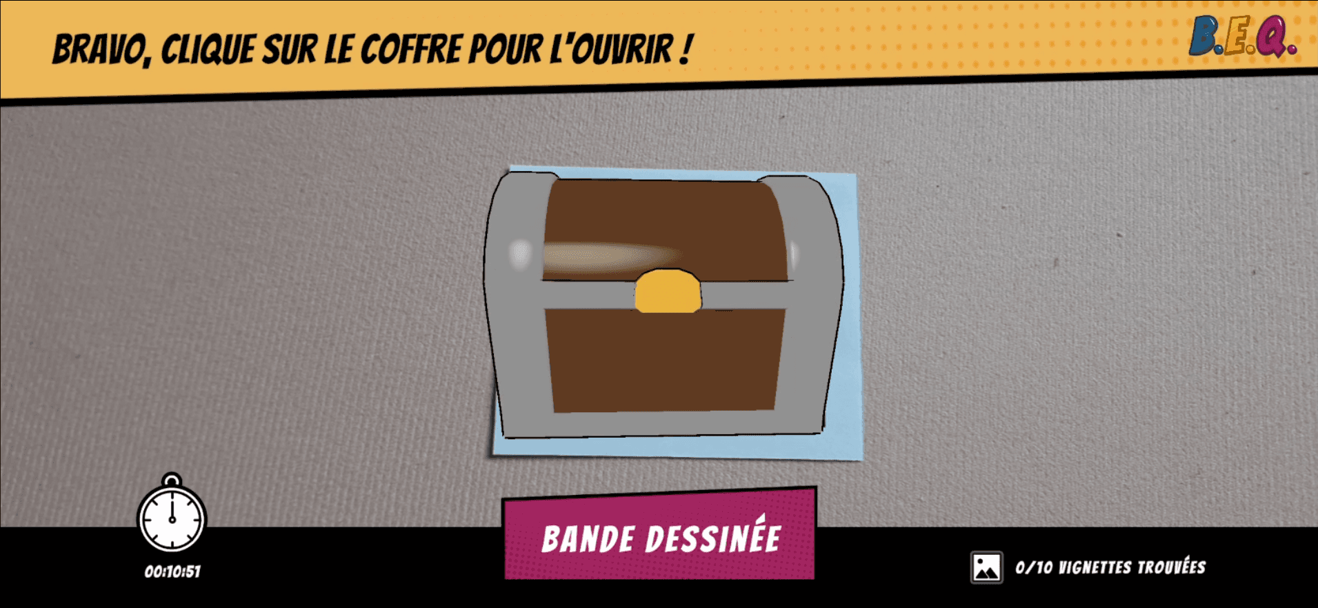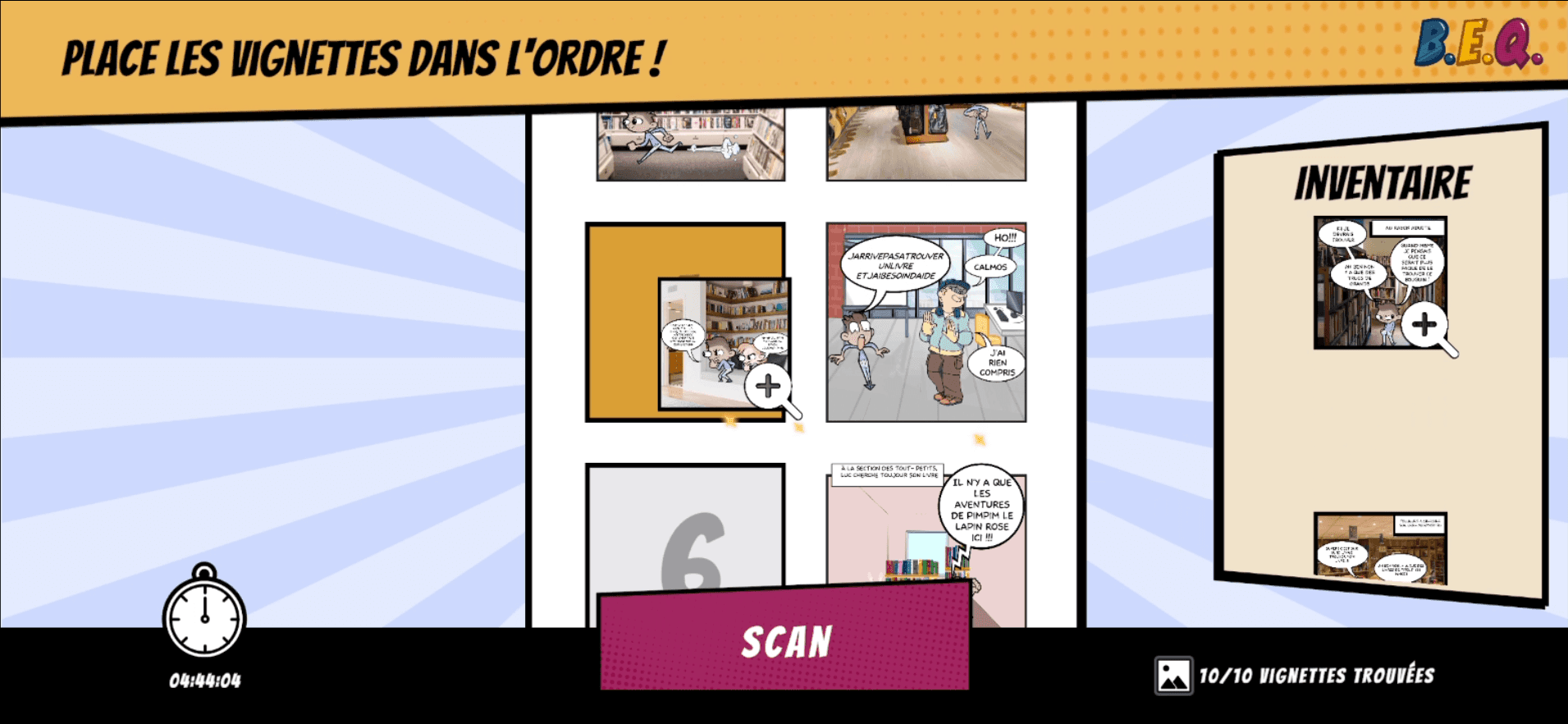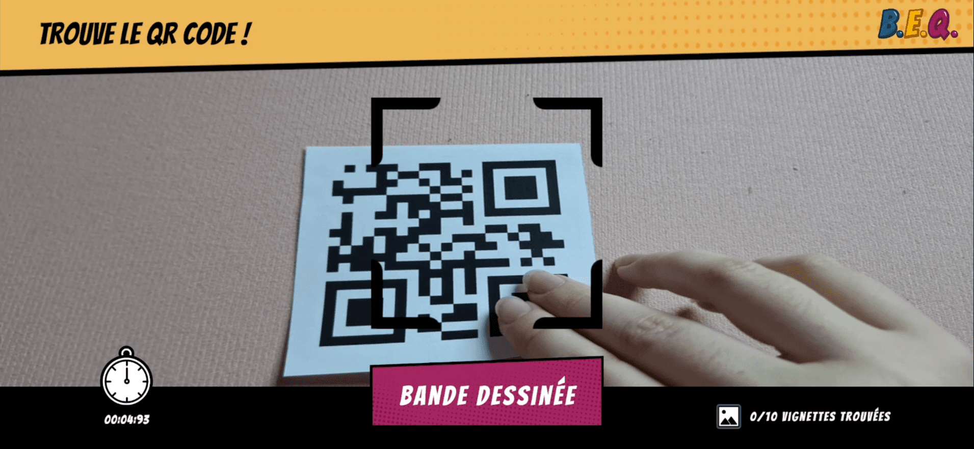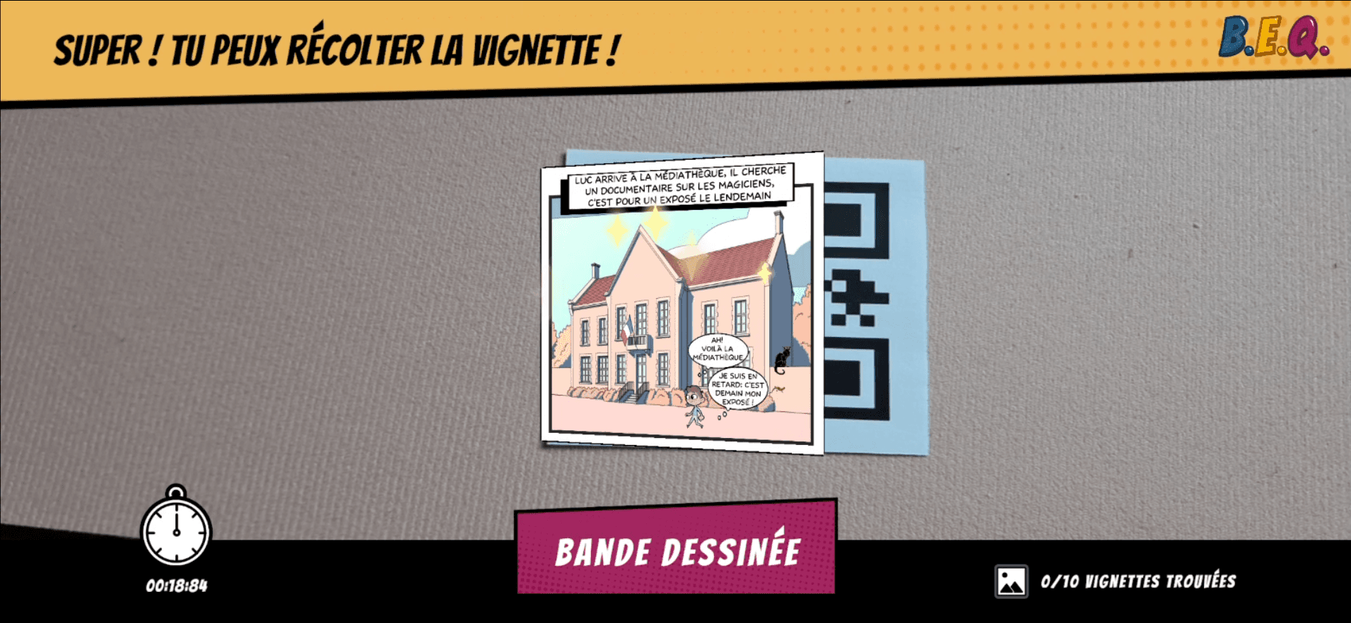 Le joueur scanne des QR Codes cachés dans les différentes salles, répond à un quiz et collecte des vignettes pour reconstituer une BD réalisée par des enfants.